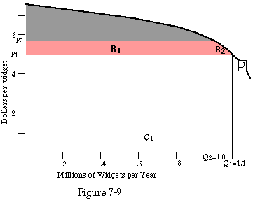 What we left out of our initial analysis of the cost of taxation was consumer (and producer) surplus, which was introduced in Chapter 4 (and 5) to measure the benefit to a consumer (producer) of being able to purchase (sell) as much as he wanted of a good at a particular price. Before the tax, the consumer could purchase as many widgets as he wanted at $5 apiece; afterwards he could purchase as many as he wished at $5.60 apiece. The cost to him of the tax is the difference between the consumer surplus he received in the first case and the consumer surplus he received in the second. This is shown in Figure 7-9. The entire shaded and colored area of Figure 7-9 is the consumer surplus received before the tax. The darkly shaded area is the consumer surplus received after the tax. The colored area is the difference between the two--the cost of the tax. It is divided into two regions. R1 is a rectangle whose height is the increase in the price and whose width is the quantity of widgets being consumed after the tax (1,000,000 per year). R2 is an (approximate) triangle representing the lost consumer surplus on the 100,000 widgets per year that were consumed before the tax and are not consumed after the tax. R1 is the amount of the tax paid by the consumers, in the sense discussed earlier in this chapter--the price increase times the quantity being consumed after the tax is imposed. R2 is part of the excess burden of the tax. R1 is a loss to the consumers and an equal gain (in tax revenue) for the government; R2 is a loss for the consumers with no corresponding gain for anyone. It has often been argued that the ideal system of taxes is that which minimizes excess burden, thus collecting a given amount of revenue at the lowest possible cost.