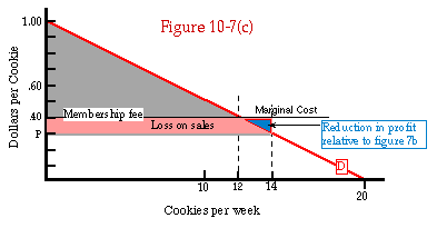 There is an easier way to do the same thing. The next year, the company announces a new and much simpler pricing policy. Cookies will no longer be sold to the general public--only to members of the cookie club. Members can buy cookies at cost--$0.40/cookie--and may buy as many as they wish at that price. The membership fee is $3.60/week. That, by a curious coincidence, is the total consumer surplus received by a consumer who is free to buy as many cookies as he wants at a price of $0.40/cookie. This two-part price (membership plus per-cookie charge) first maximizes the sum of consumer and producer surplus (by inducing the consumer to buy every cookie that is worth at least as much to him as it costs to produce) then transfers the entire consumer surplus to the producer.