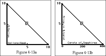 7. Figure 4-13b shows your demand curve for sapphires. For religious reasons, sapphires can neither be bought nor sold. You accidentally discover 100 carats of sapphires. How much better off are you?