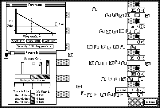 The purpose of this program is to give the student a feel for the logic of such equilibria by letting him watch a model of a set of supermarket lines. The student can alter various features of the situation and observe the effect. At the simplest level the lesson is an understanding of how and why negative feedback makes all lines equal and how, in a corner solution, it fails to do so. At a higher level, the model shows how rational search, whether for the shortest line or for other information relevant to the correct choice, ends up, in equilibrium, generating equally attractive outcomes for those who do and do not choose to search.