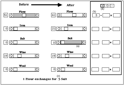 The student controls several factories. Each has a fixed amount of labor available per week, and output rates/unit labor for different goods. Each also has its own market with demand curves. Factories can sell locally or export with a small transport cost. Student tries to maximize his profits. He discovers "trade" based on comparative advantage.